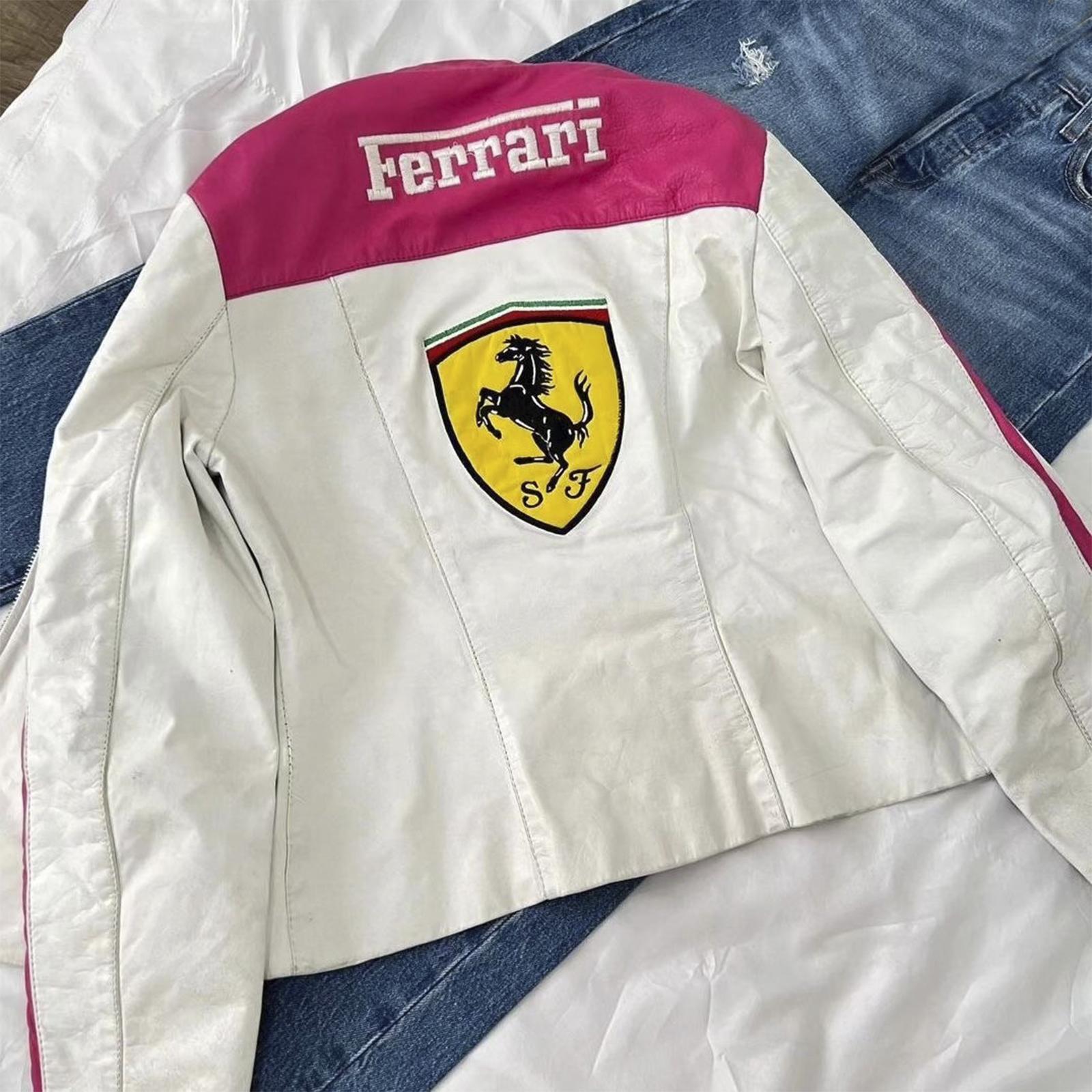 Fuel your style with this head-turning Ferrari-inspired women's racing leather jacket, designed for bold, confident women who crave speed, power, and luxury. Crafted from premium white lambskin leather with striking pink detailing, this Formula 1-style jacket delivers high-octane fashion and elite streetwear vibes.