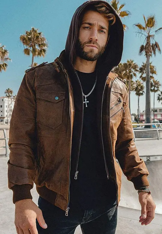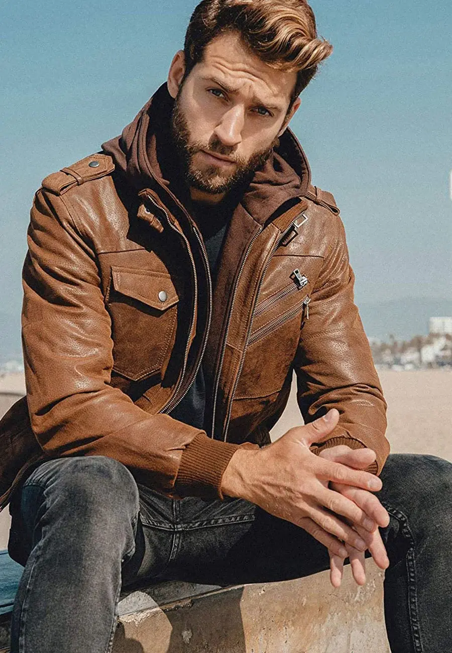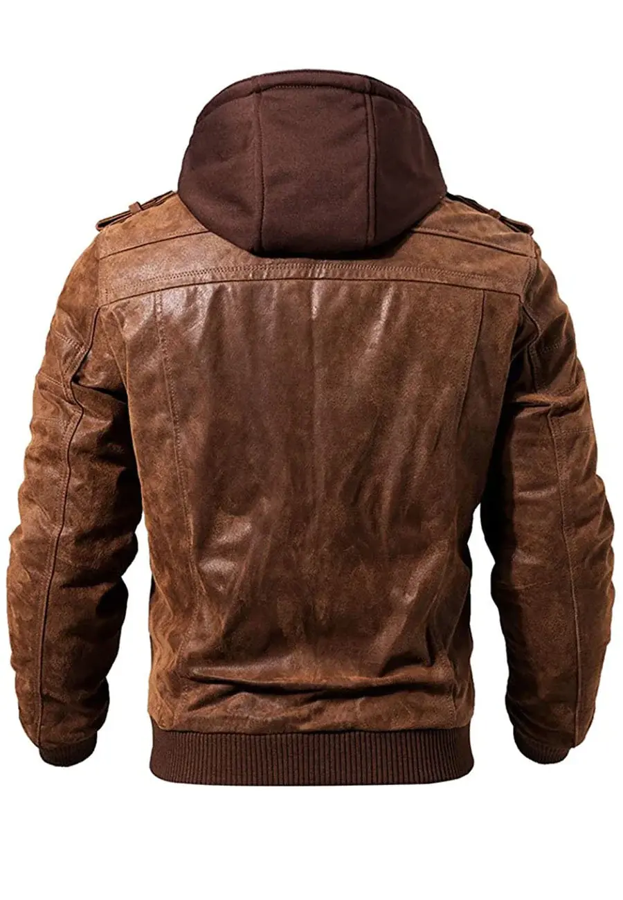 Elevate your style with this men’s brown sheepskin leather bomber jacket, crafted from 100% genuine leather for a rugged, premium feel. Featuring a detachable hood, waxed vintage finish, and quilted lining for all-weather comfort, this jacket is perfect for casual wear, biker fashion, and street style. Whether you’re hitting the road or stepping out in style, this iconic bomber ensures a bold, masculine look. Limited stock – Order now & upgrade your wardrobe today!