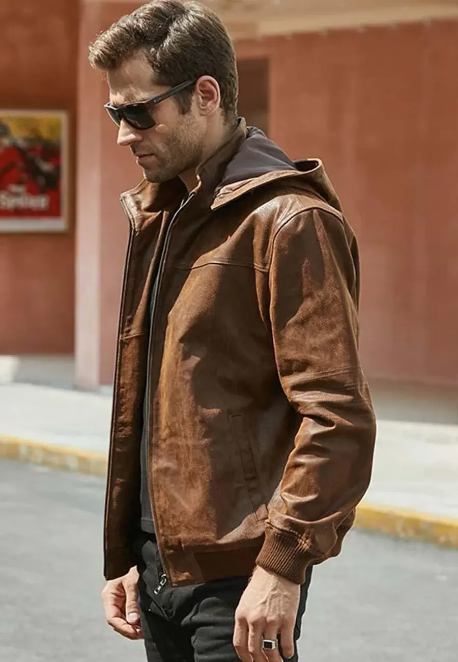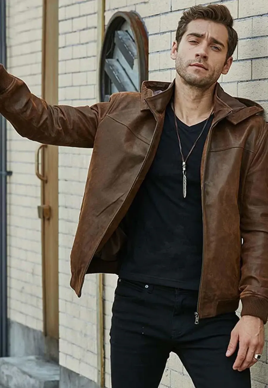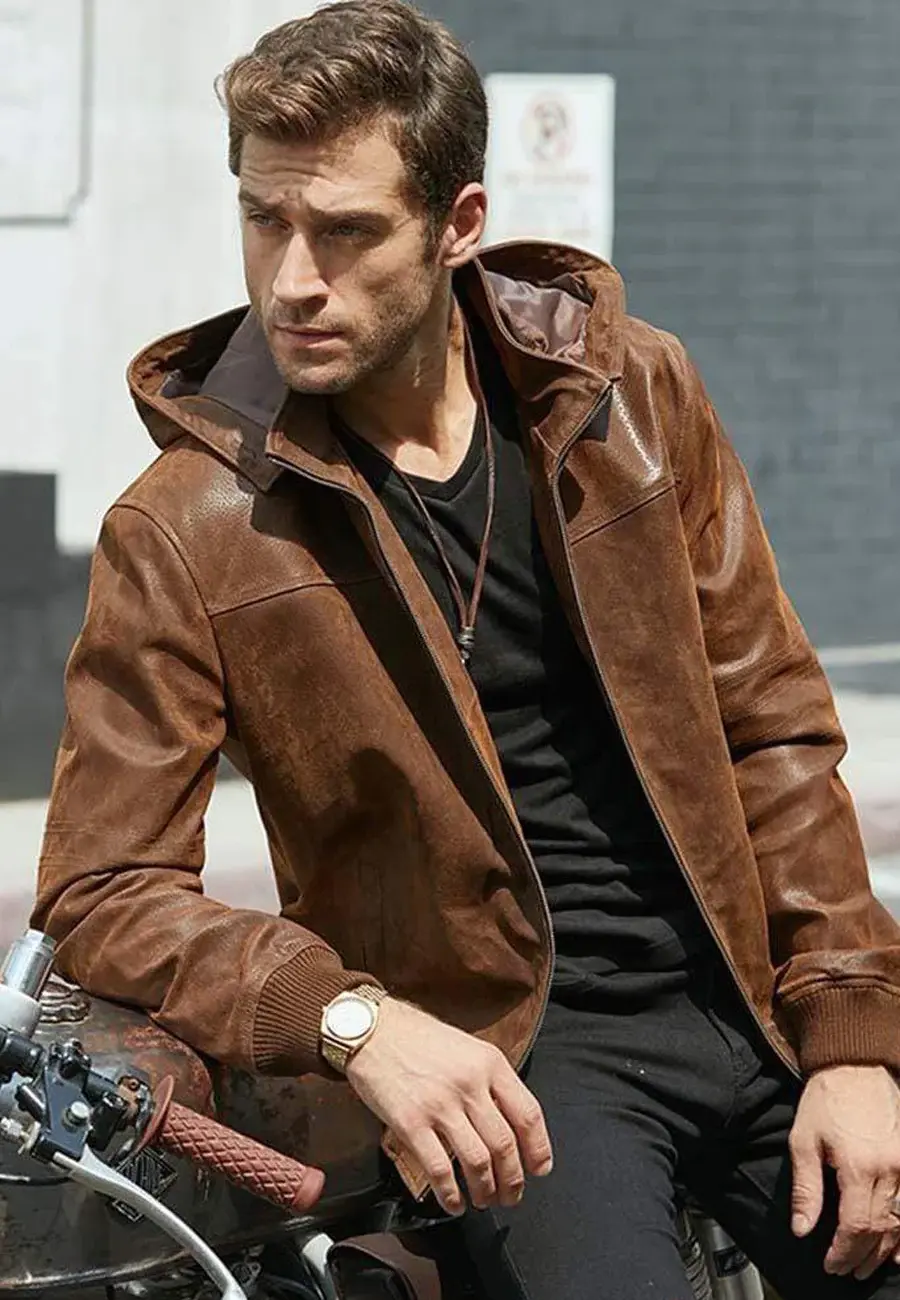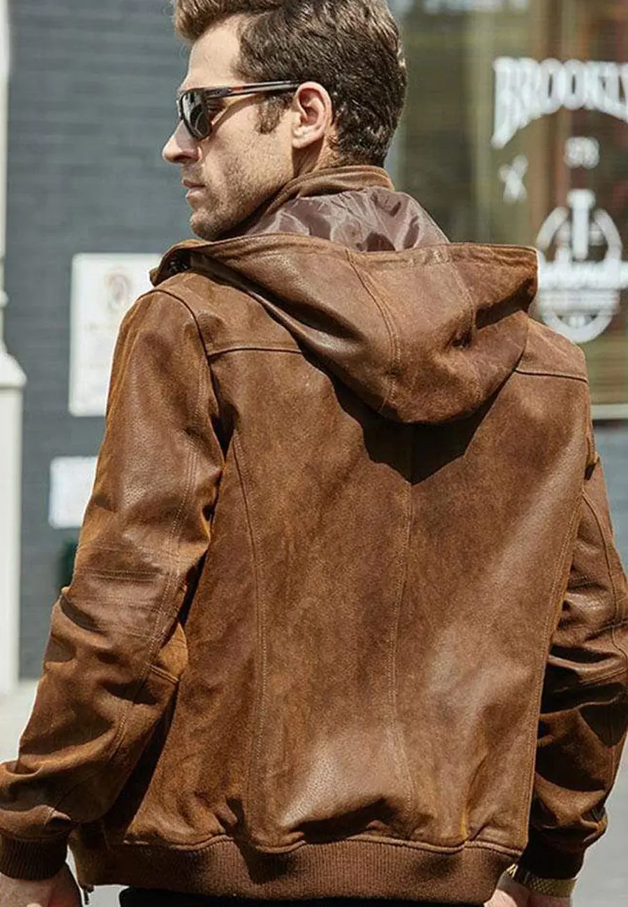 Level up your style with this premium men’s brown sheepskin leather hooded bomber jacket – designed for those who crave rugged elegance & unbeatable comfort. Made from 100% genuine sheepskin leather, this waxed vintage biker jacket features a detachable hood, soft inner lining, and ribbed cuffs for a perfect fit in all seasons. Whether you’re riding, out on the town, or layering up for winter, this classic leather jacket is a must-have. SHOP NOW & UPGRADE YOUR LOOK!