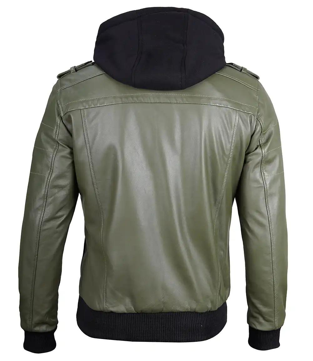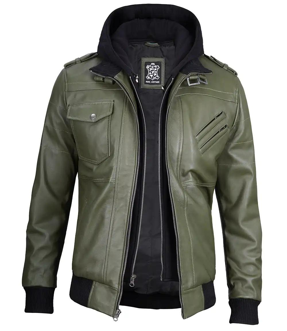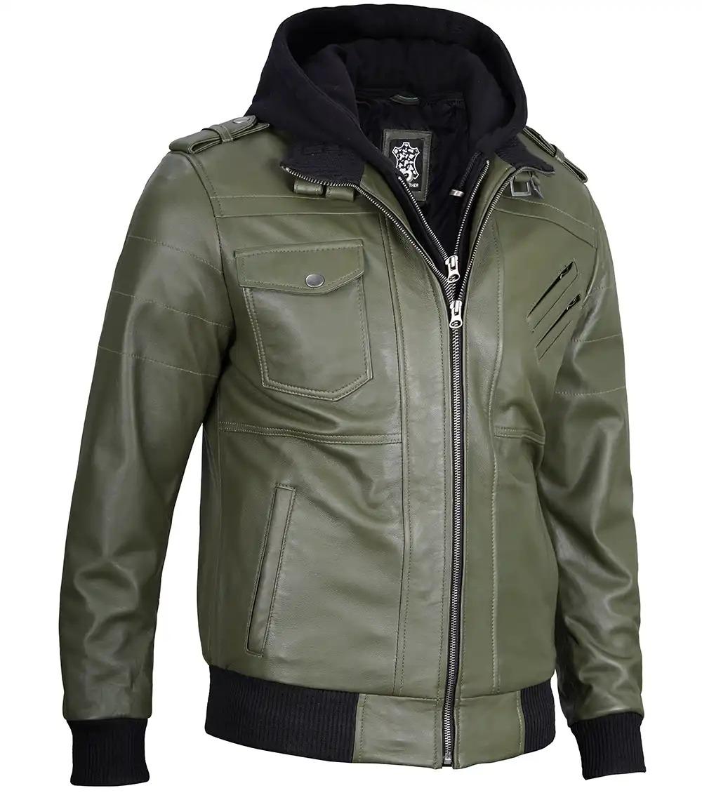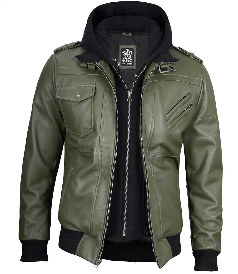 Turn heads in this badass men’s green leather hooded jacket made from 100% real leather. Featuring a removable fleece hoodie, rugged detailing, and winter-ready warmth — it’s built to perform, styled to stun. Order now and own the streets – limited stock!