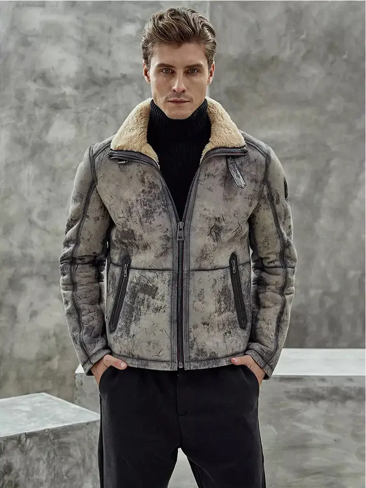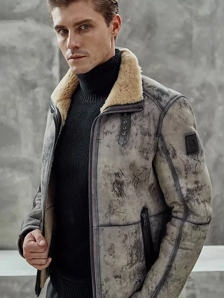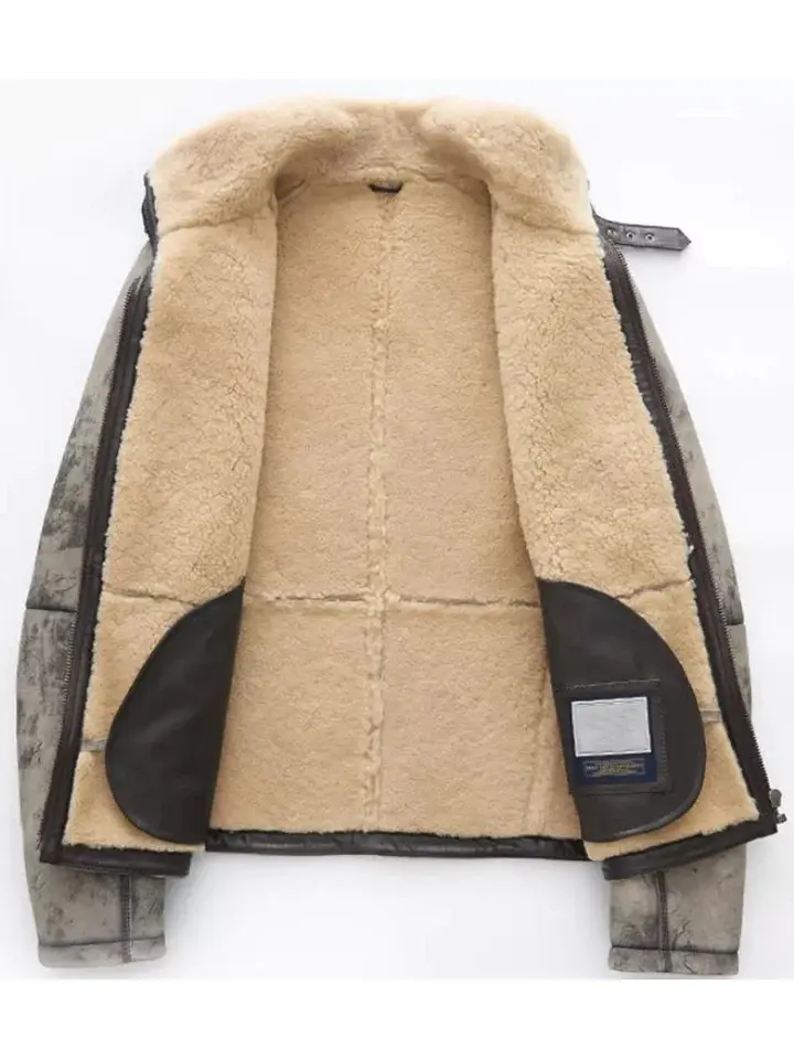 Stay warm in style with this premium distressed shearling aviator jacket – a timeless B3 flight bomber coat designed for ultimate comfort and durability. Crafted from high-quality leather with a rugged vintage finish, this luxury winter jacket features a thick shearling lining, a classic pilot-style collar, and a tailored fit for an effortlessly bold look. Whether you're braving the cold or making a fashion statement, this aviator bomber jacket is the perfect blend of heritage, warmth, and masculinity.
